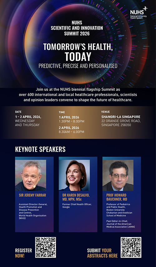 The biennial NUHS Scientific and Innovation Summit returns in 2026. Join us at this signature gathering of over 600 international and local healthcare experts, scientists and opinion leaders to shape the future of healthcare. Click here to find out more.